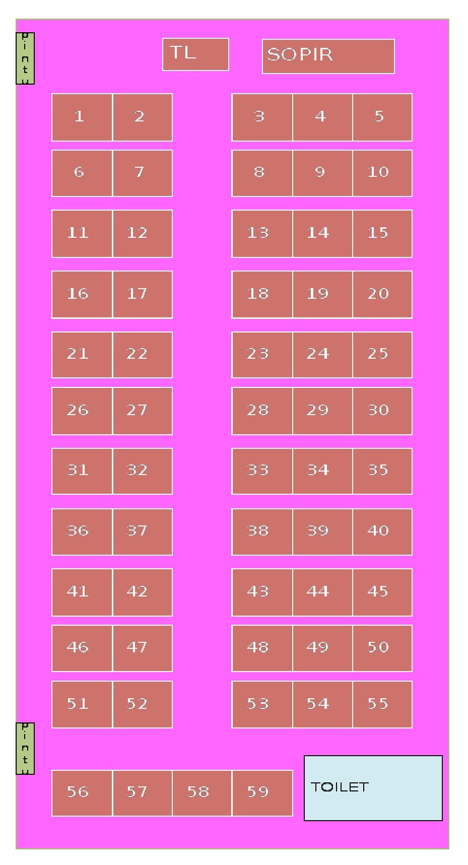 Denah kursi bus pariwisata 60 seat, denah tempat duduk bus 60 kursi,. Selain tipe bangku yang digunakan, jumlah seat pada beberapa ukuran bus juga menjadi salah satu faktor yang menentukan tingkat . Gambar denah bangku bus pariwisata seat 2 gambar tempat duduk di. Sy nitha dari kantin ruko bogor nirwana resindence. Download denah tempat duduk bus seat 59 word, denah kursi bus pariwisata 60 seat word, denah kursi bus 32 seat, denah tempat duduk bus excel . Contoh denah tempat duduk bus pariwisata seat 2 2 kapasitas 48 dan . Informasi terlengkap tentang denah tempat duduk bus seat 33. Sy ingin menawarkan paket nasi box nya untuk sekitar . A321 200 eva air indonesia. Denah tempat duduk bus seat 59 word, denah tempat duduk bus 60 kursi, denah kursi bus pariwisata 60 seat, download denah bus seat 59, . Denah kursi 47 seats bus 1. Download denah kursi bus denah kursi bus ac medium 39 seats 2 2. Sopir 3 4 dadan r 8 dadan r 12 herman 16 herman 20 hardi 24 .